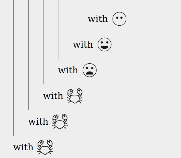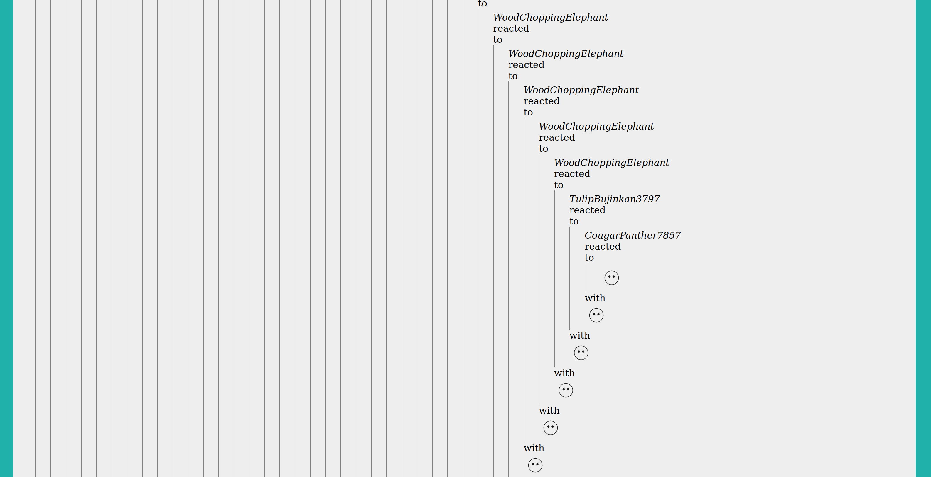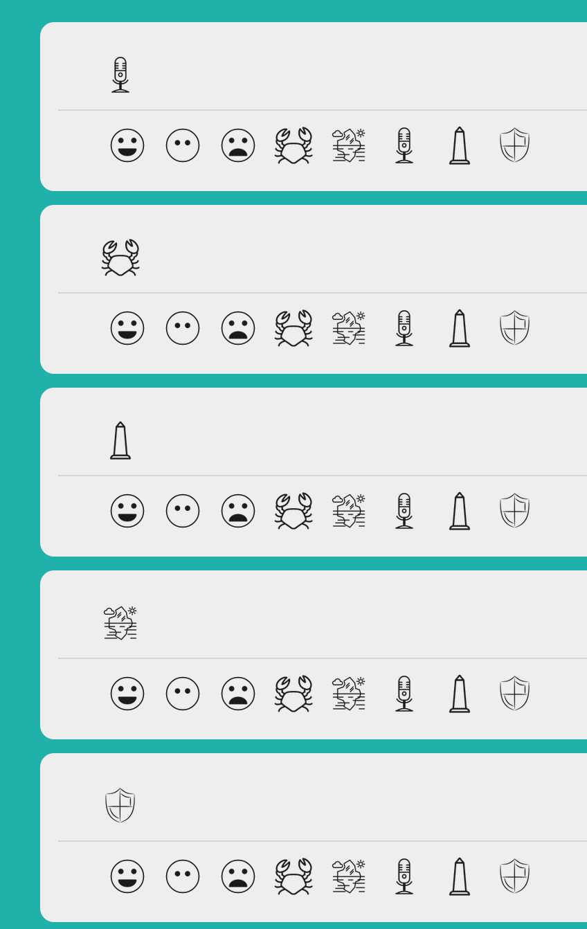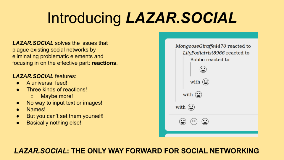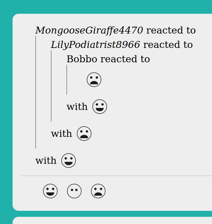 The only form of interaction is reactions - no posts, only reactions and reactions to reactions. Started with three kinds of reactions (happy, sad, and neutral) and later added five more (crab, glacier, microphone, obelisk and shield).