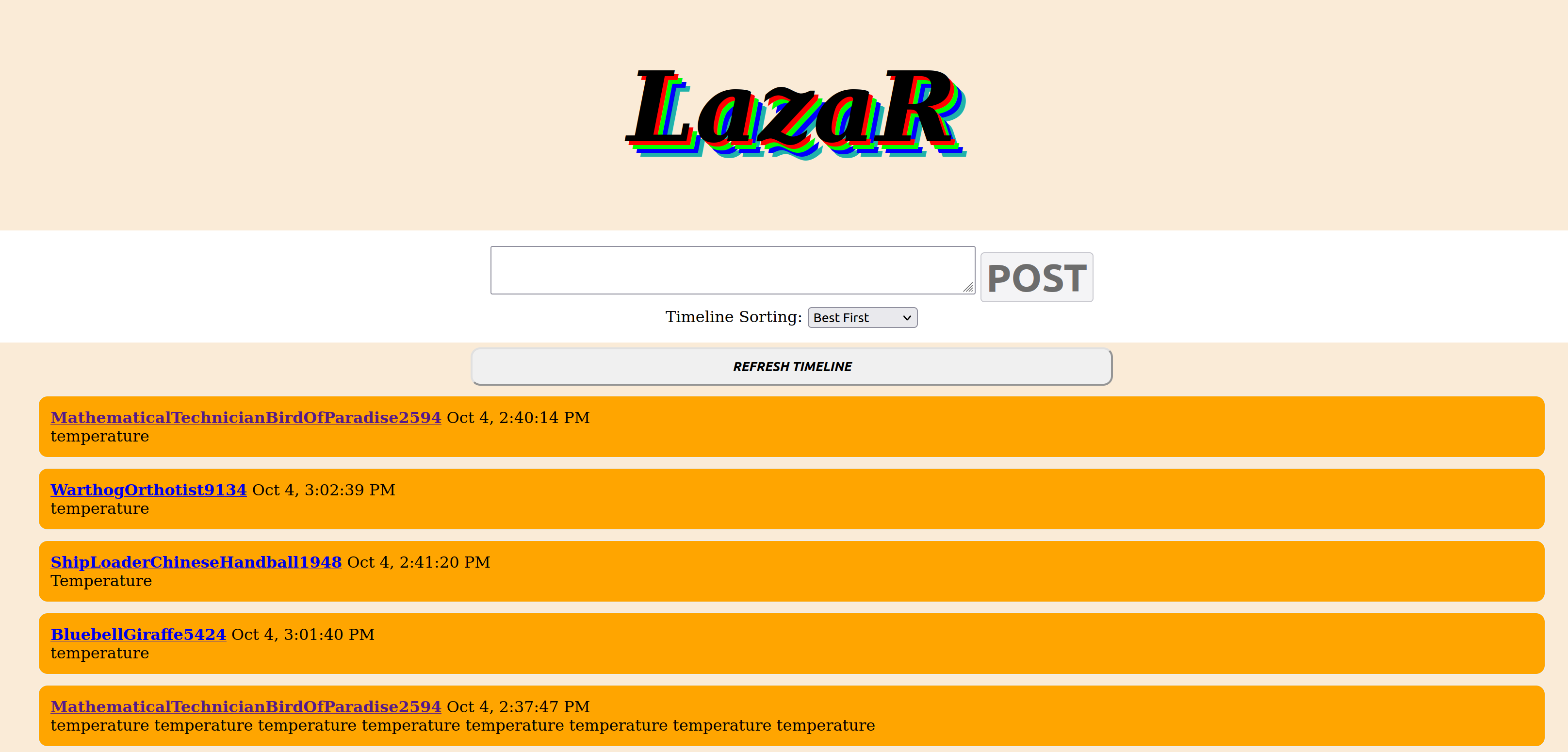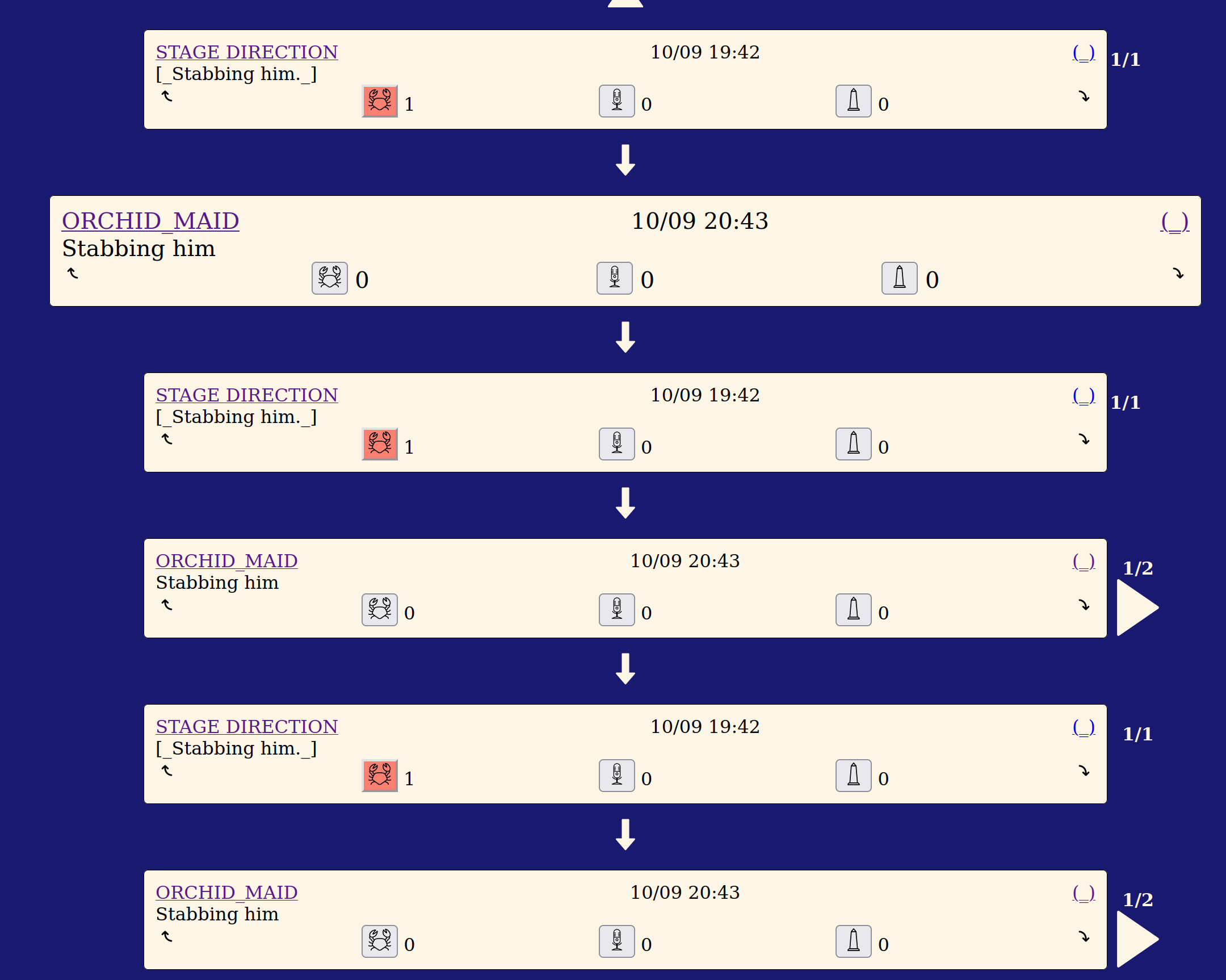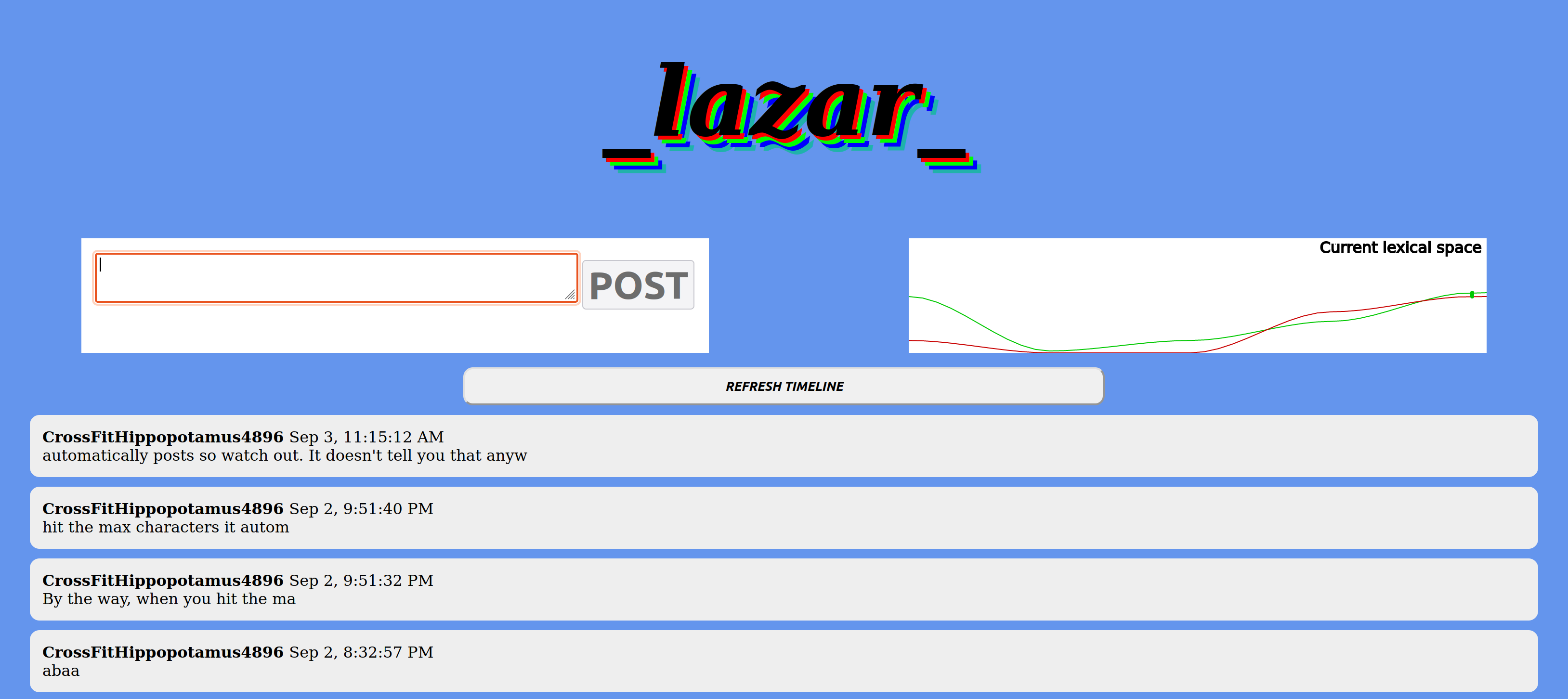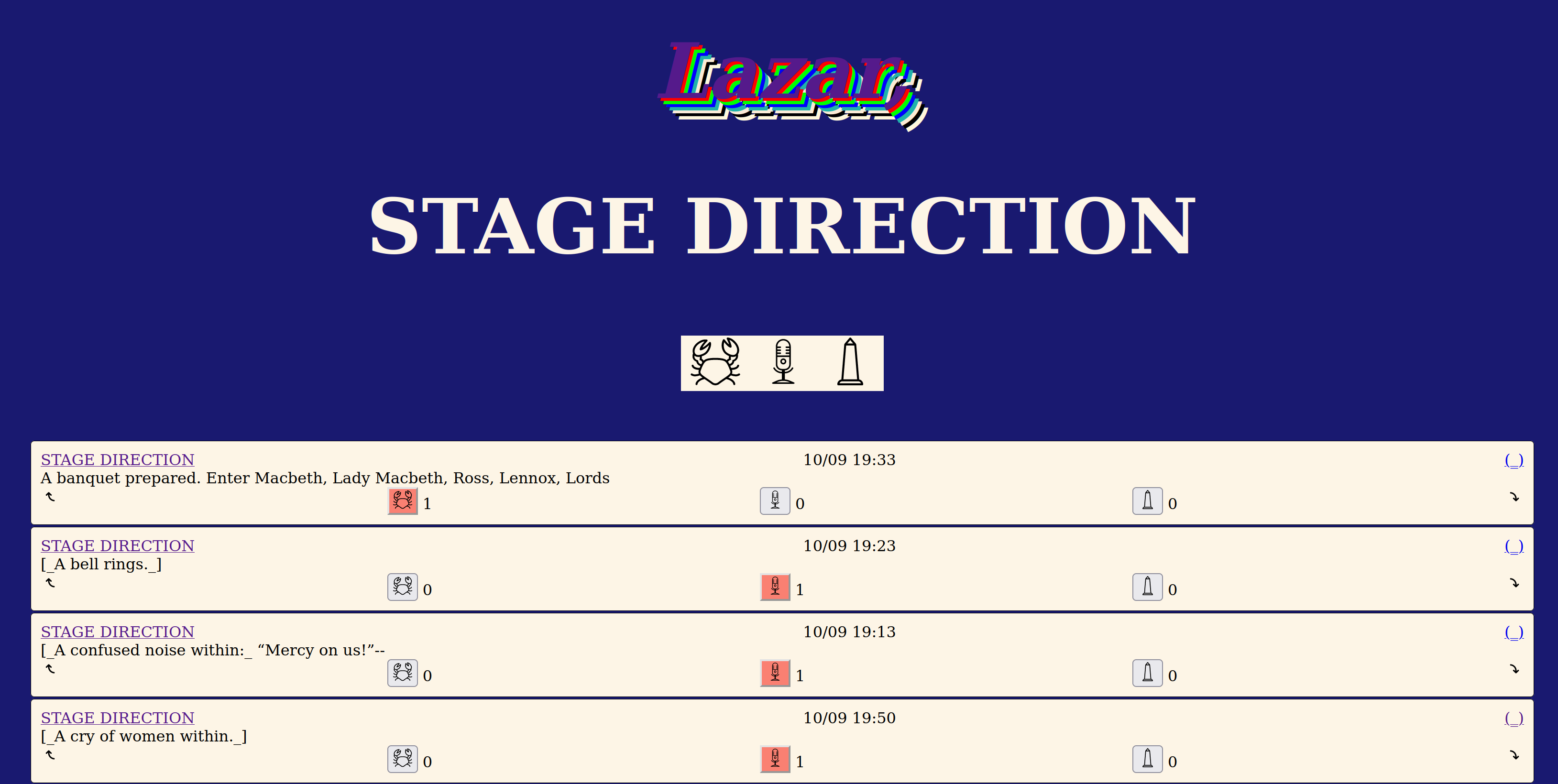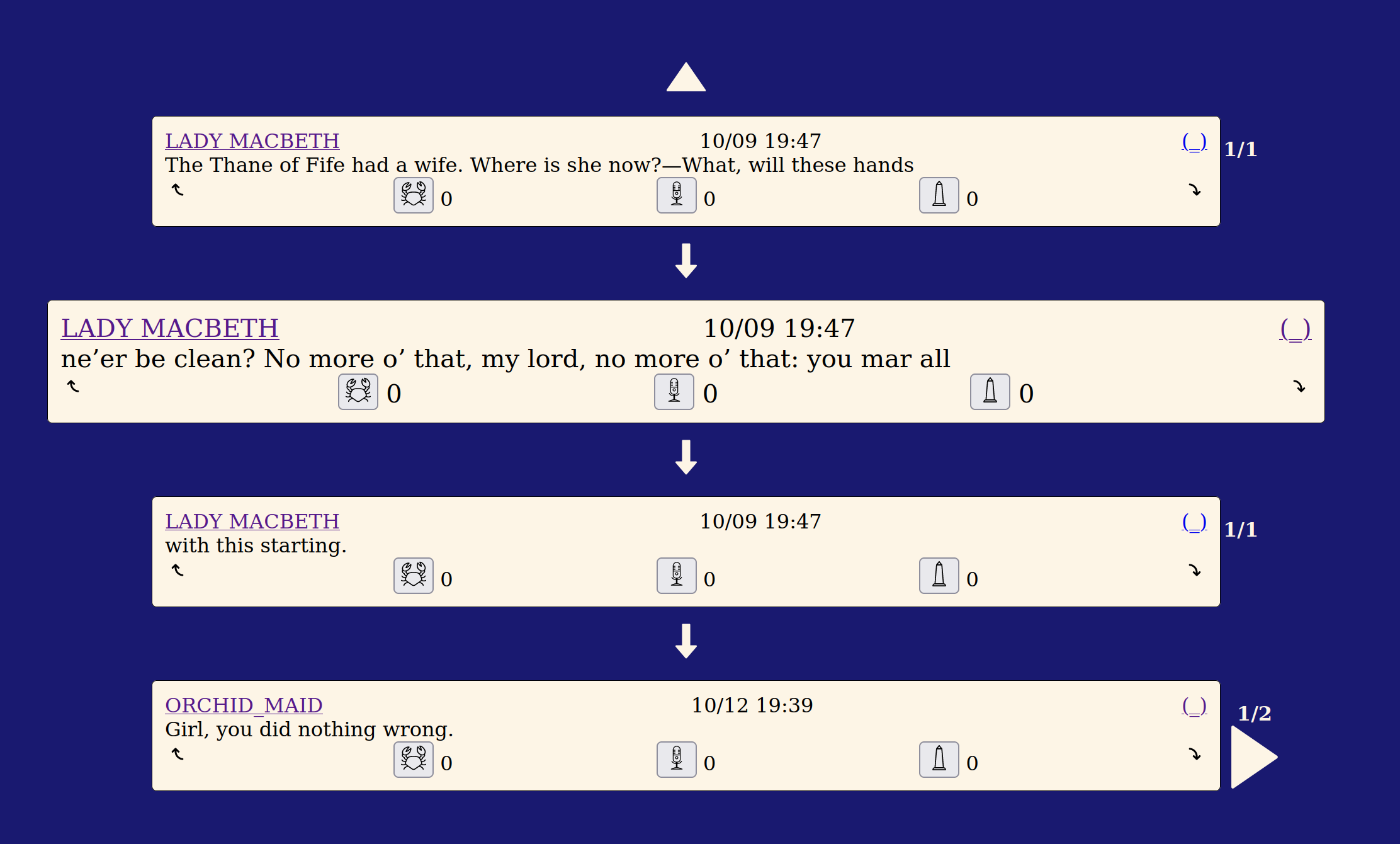 Users could "ply" posts, making an older post a reply of their new post. This allowed conversations to move both up and down and for disparate threads to be linked together. Lazar gen 6 also featured the complete scripts of Macbeth and the Tempest, converted into a social media feed. You can read an in-depth essay on gen 6 on the lazar tumblr.