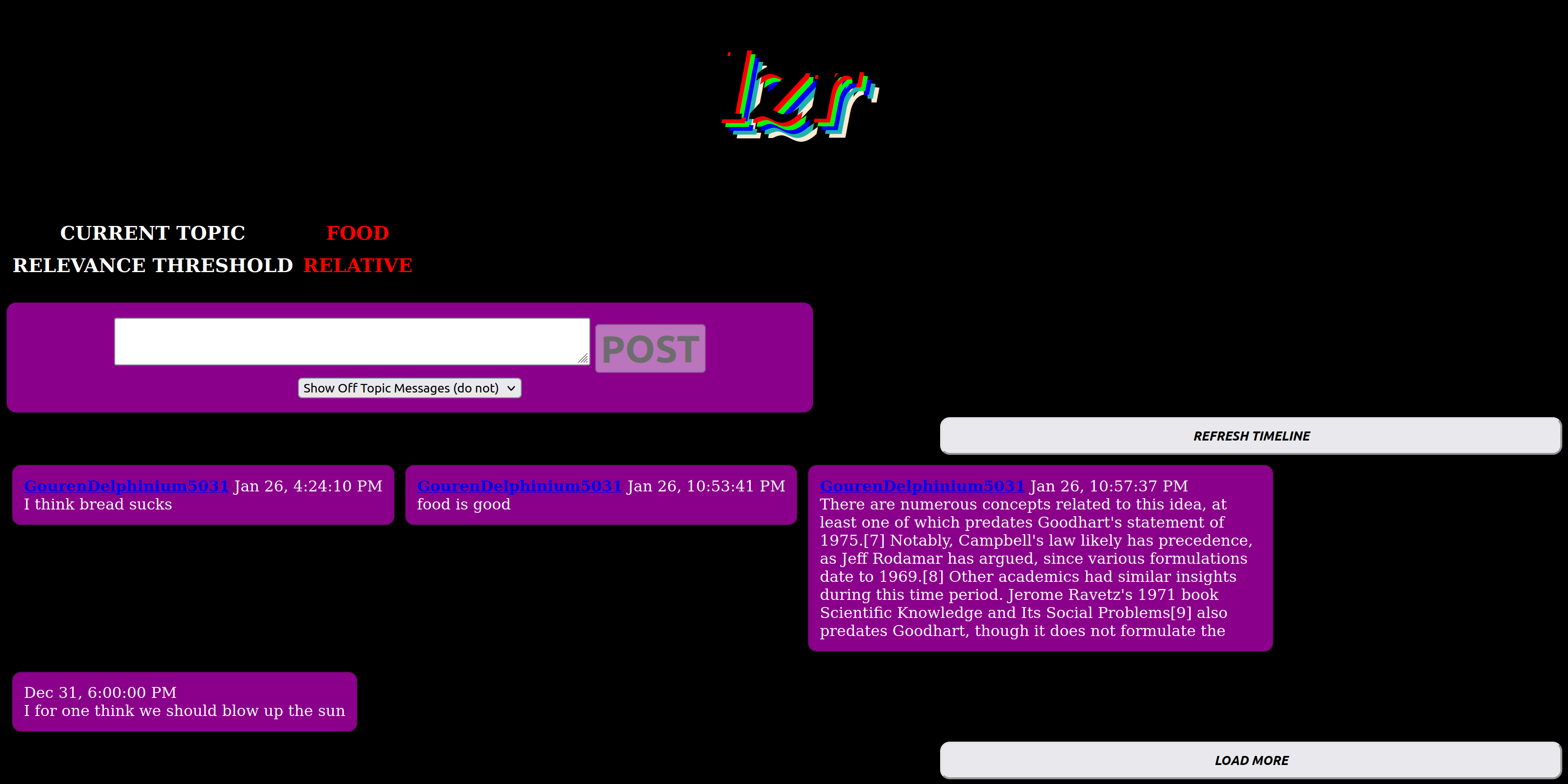 Every hour a random topic is selected and only posts judged sufficiently on-topic are displayed.