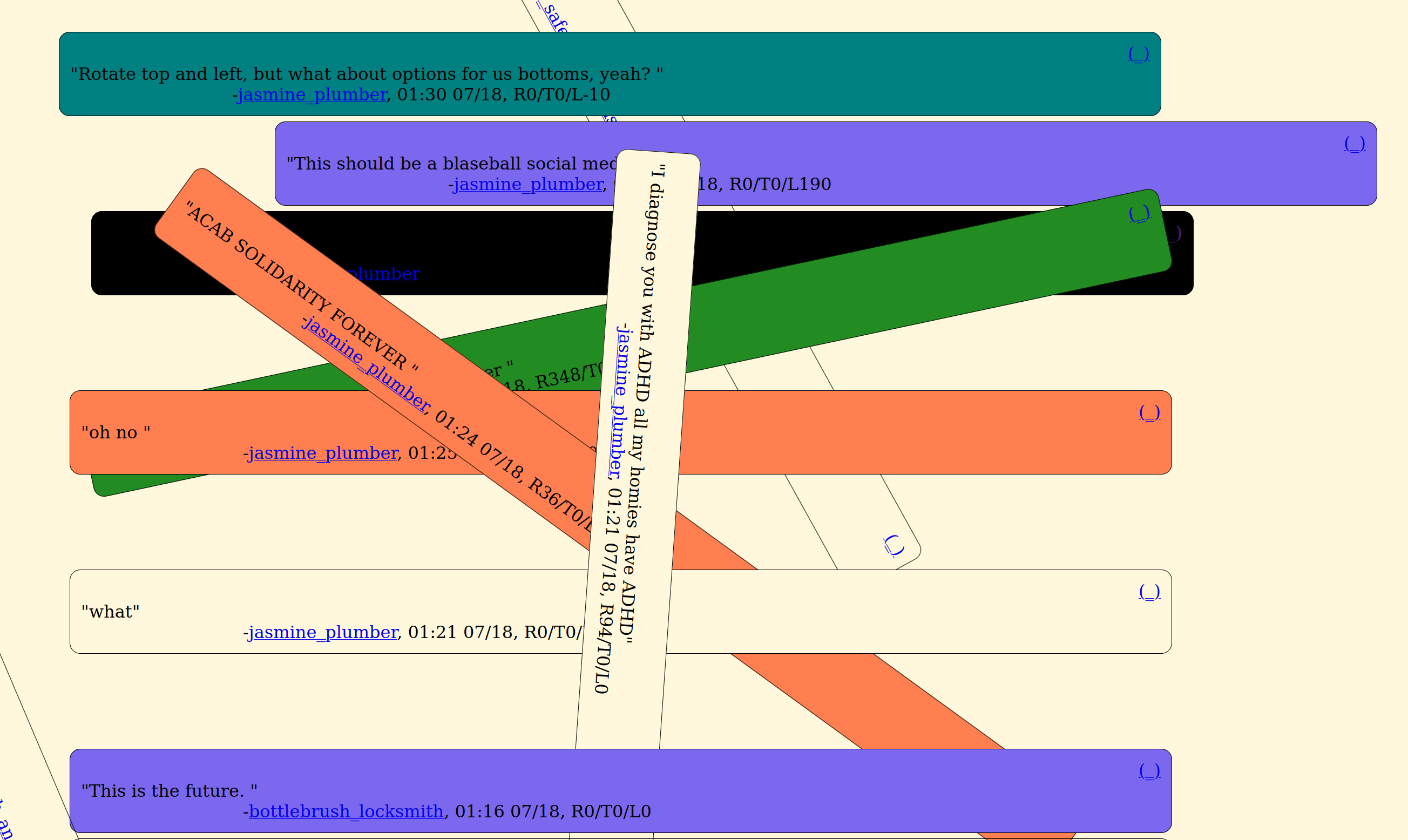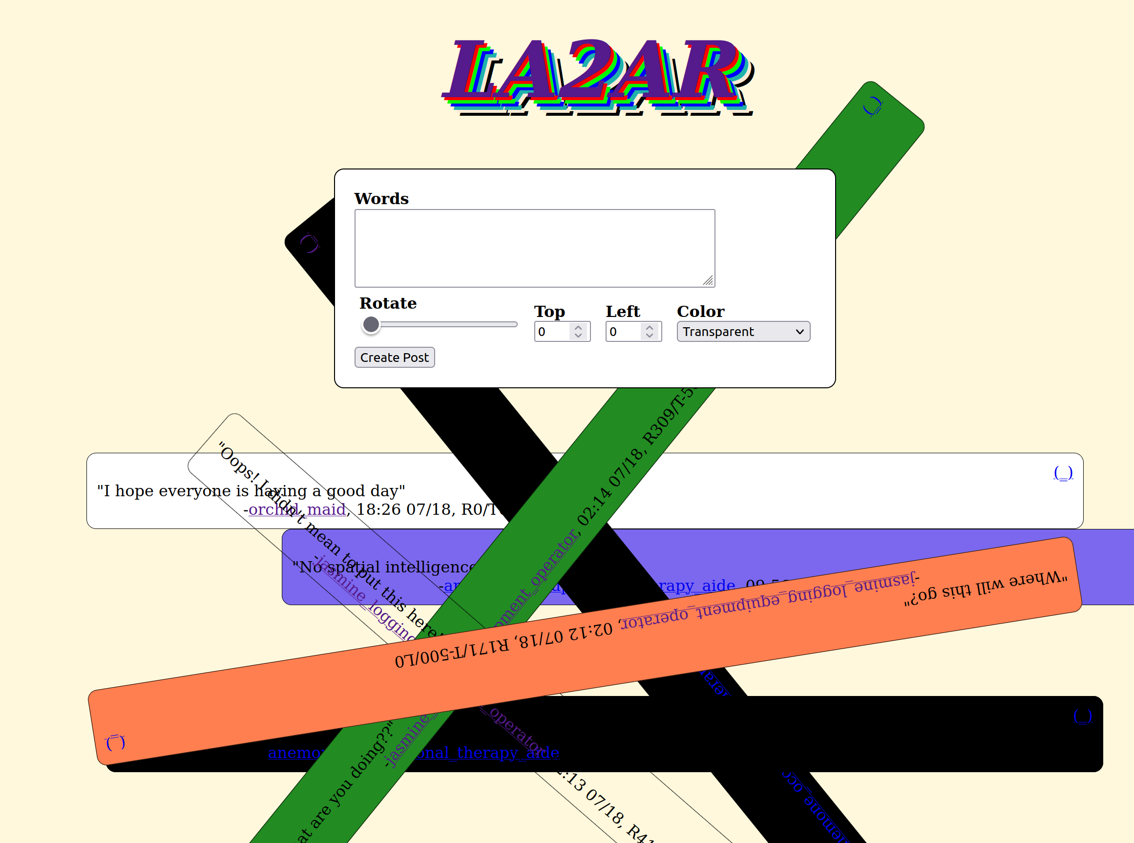 Users were given full control of their posts background color, rotation, and positioning on the page. View the state of the site at time of close here. You can read an in-depth essay on gen 5 on the lazar tumblr.